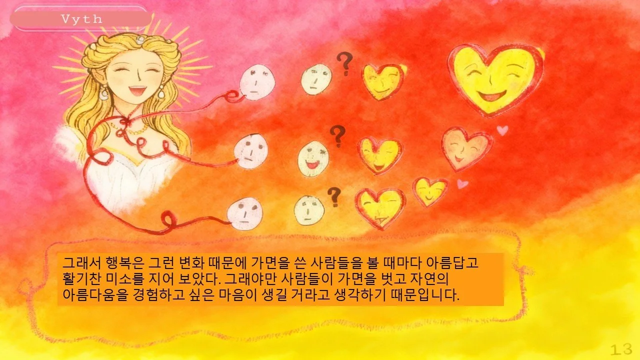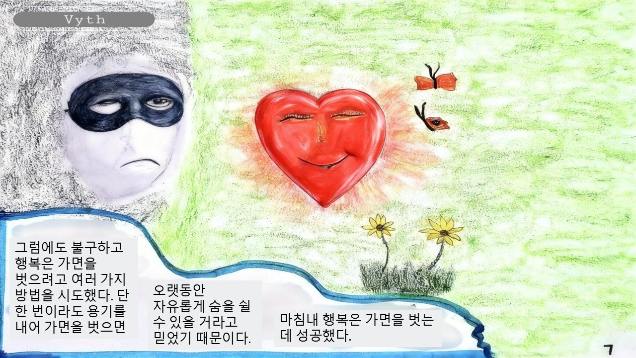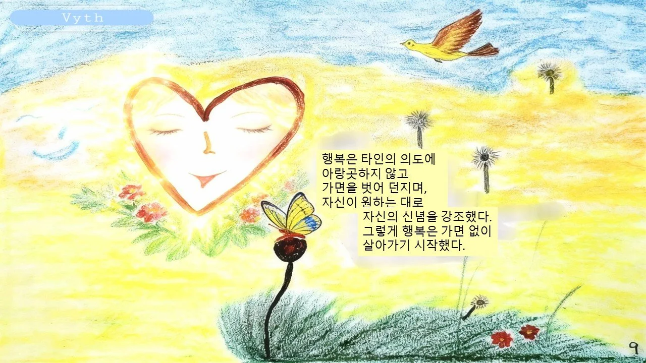 The message of book is not only for kids but also for adults. The pictures in this book is simple, but those have most of wisdom thoughts. I make three type of difference languages to publish firstly: English, Korean and Burmese. This is Korean version. In this picture book, I created 'Happiness' as a character. I hope you will enjoy with this picture book. I created a girl character with bright vibe and strength.