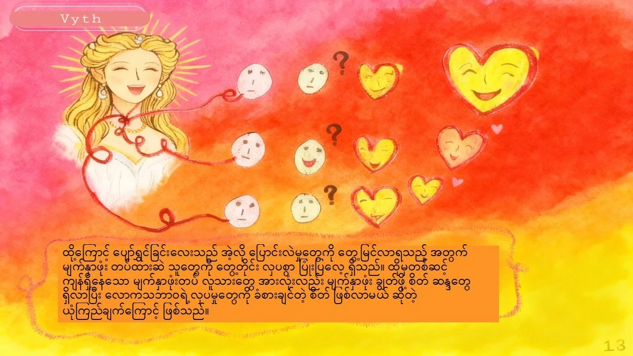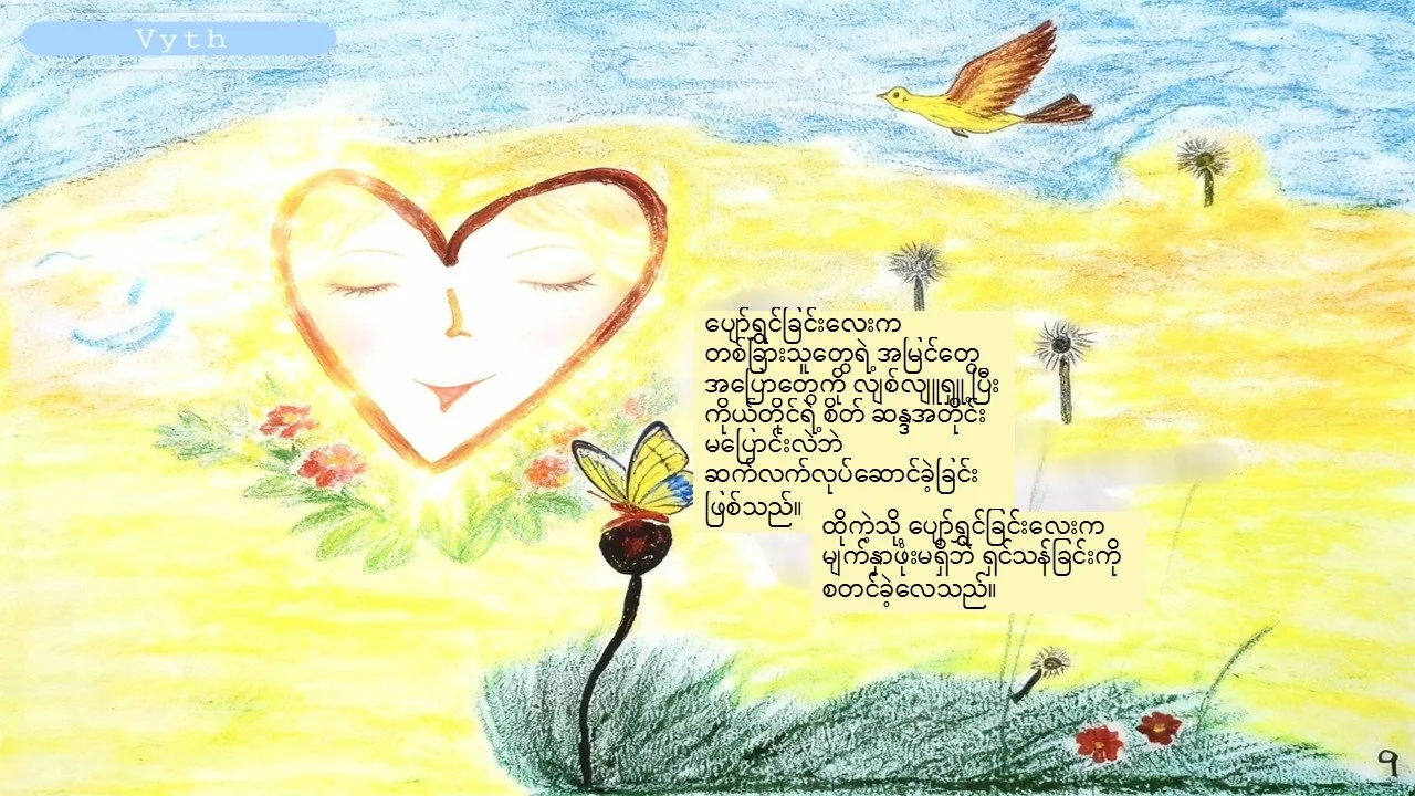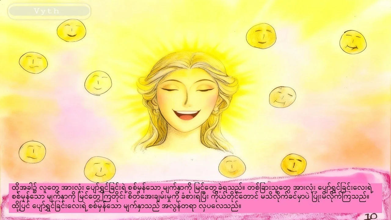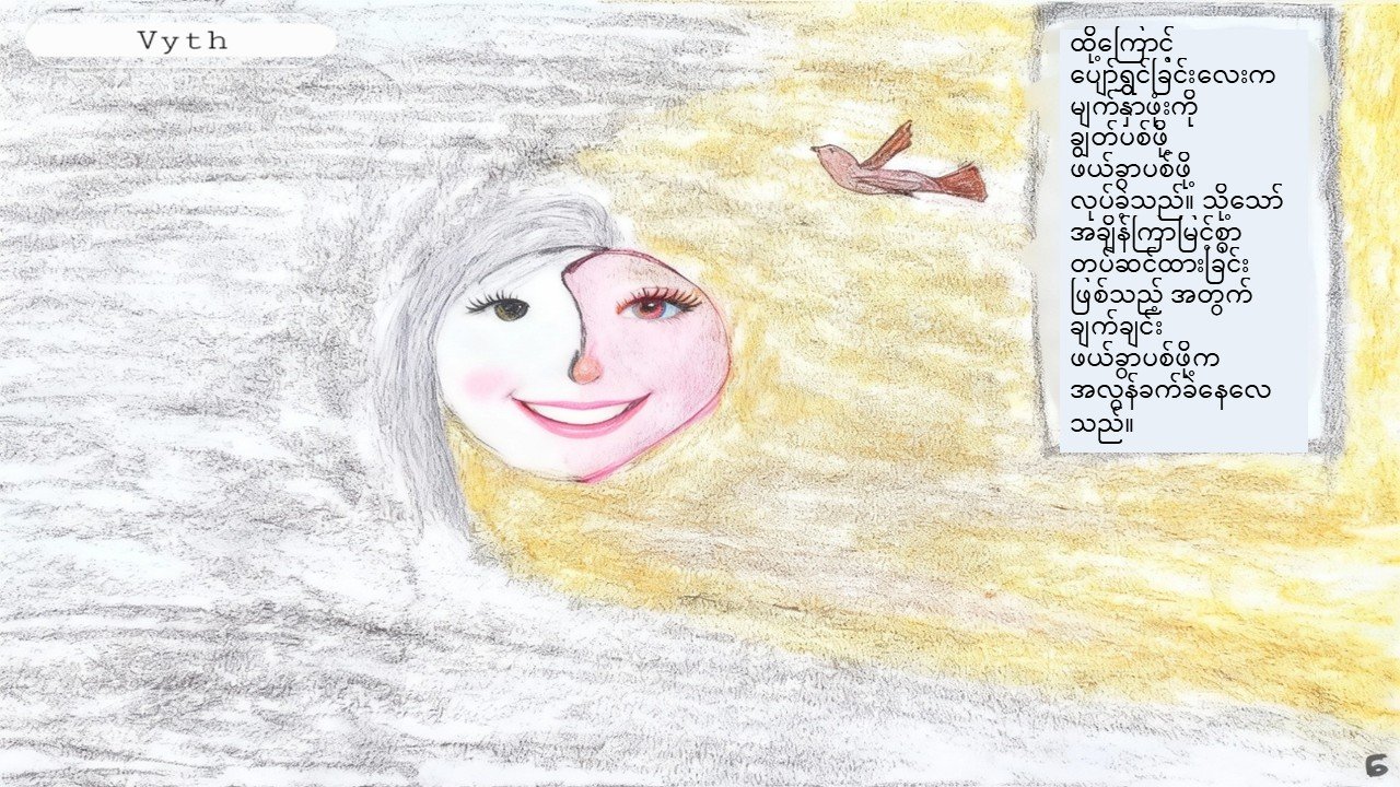 The message of book is not only for kids but also for adults. The pictures in this book is simple, but those have most of wisdom thoughts. I make three type of difference languages to publish firstly: English, Korean and Burmese. This is Burmese version. In this picture book, I created 'Happiness' as a character. I hope you will enjoy with this picture book. I created a girl character with bright vibe and strength.